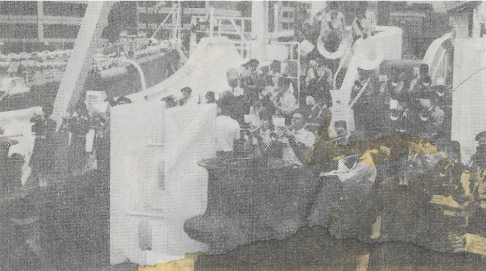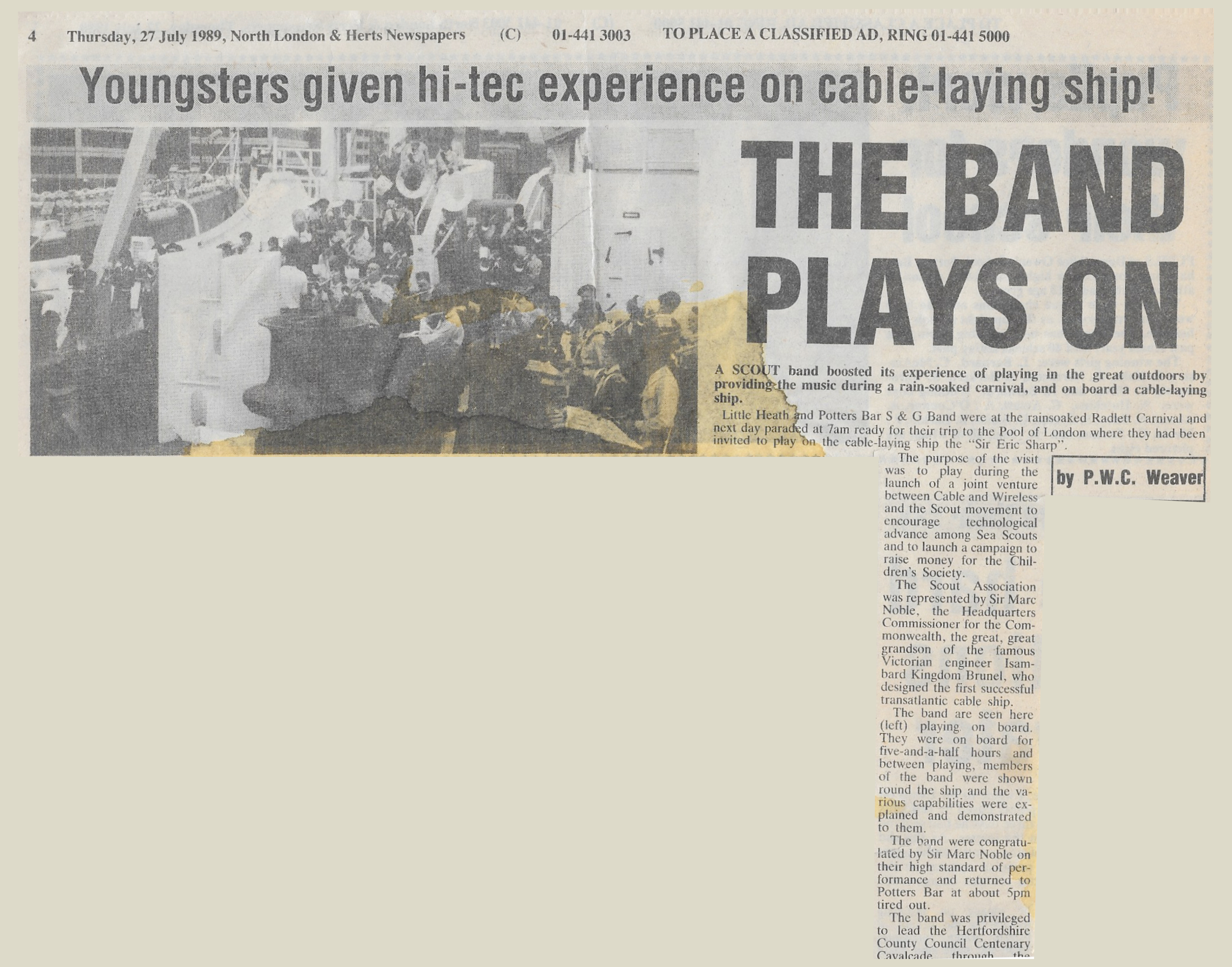 Drum Major Sue Crane boarded the "Sir Eric Sharp" to lead the band in playing on the cable-laying ship, for the joint venture between Cable and Wireless and the Scout Movement.
