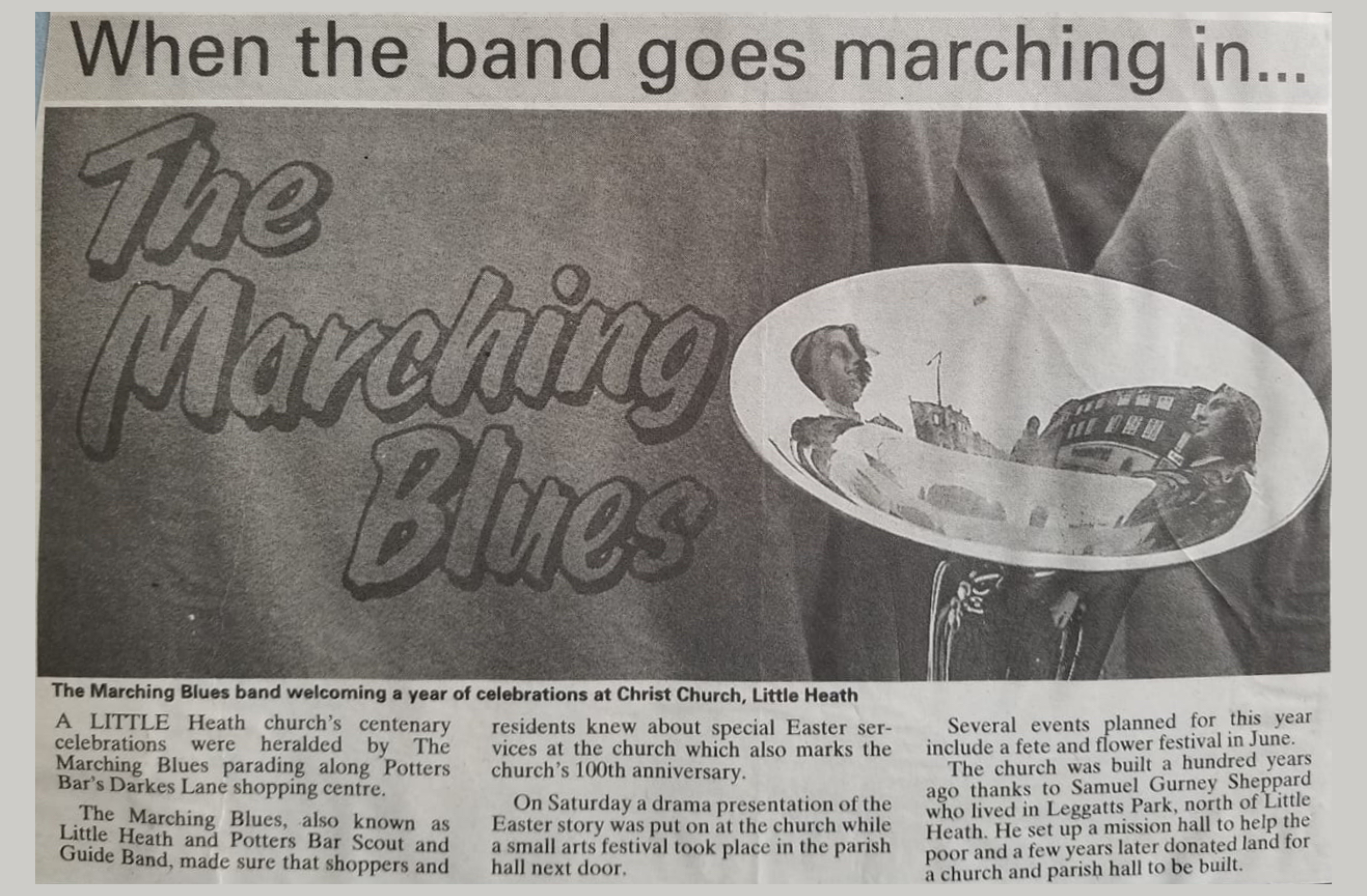 Centenary celebrations for Christ Church Little Heath were heralded by the Marching Blues who paraded along Darkes Lane entertaining shoppers and residents.