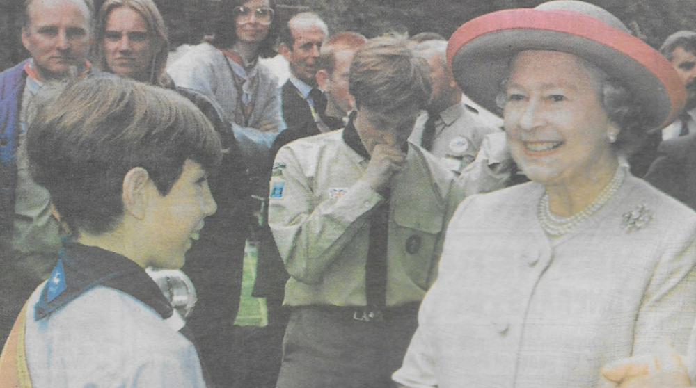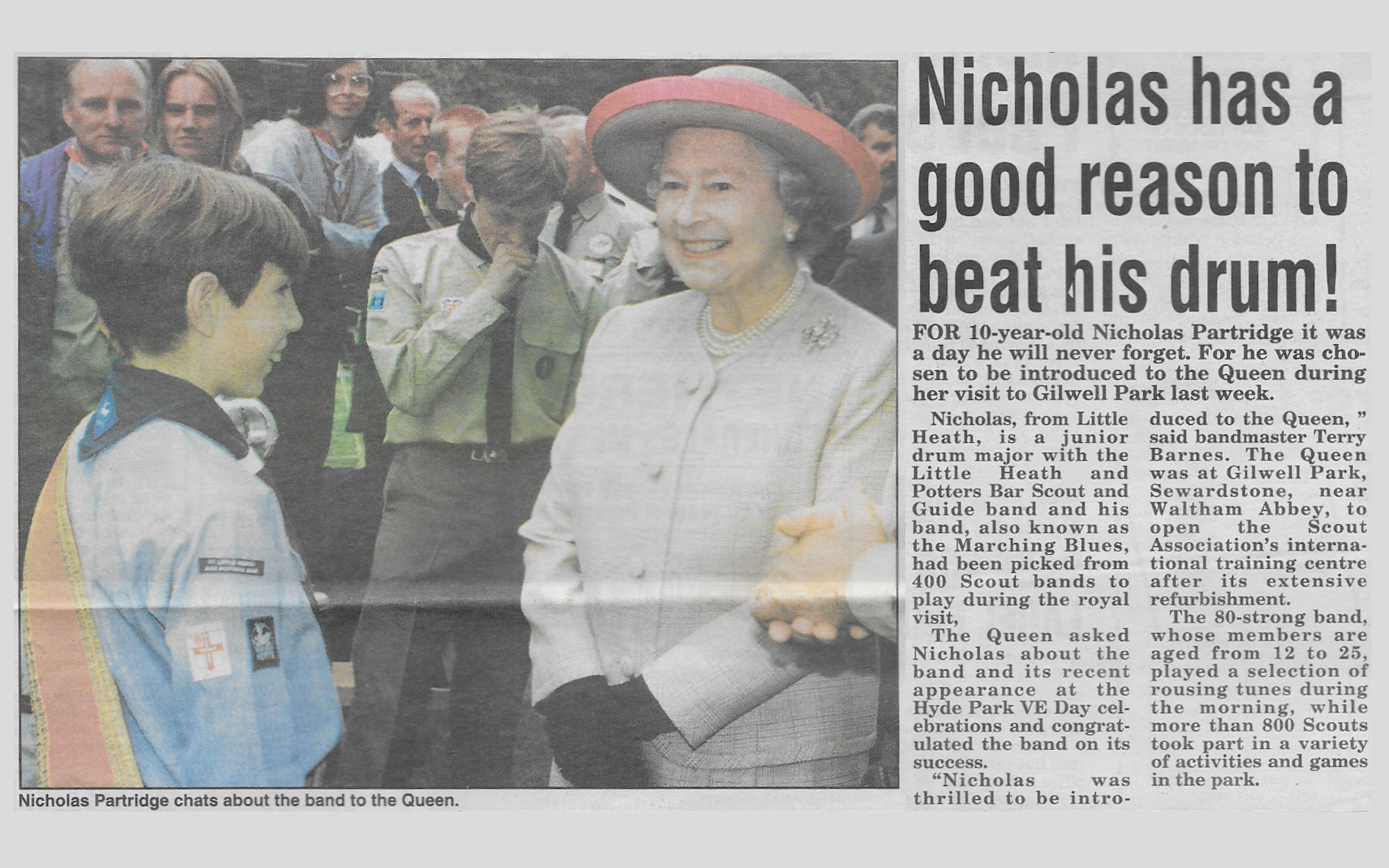 In a visit to Gillwell Park, Junior Drum Major, Nicholas Partridge met Queen Elizabeth. The 80 strong band, who were selected out for 400 scout bands, played a selection of rousing tunes during the royal visit.