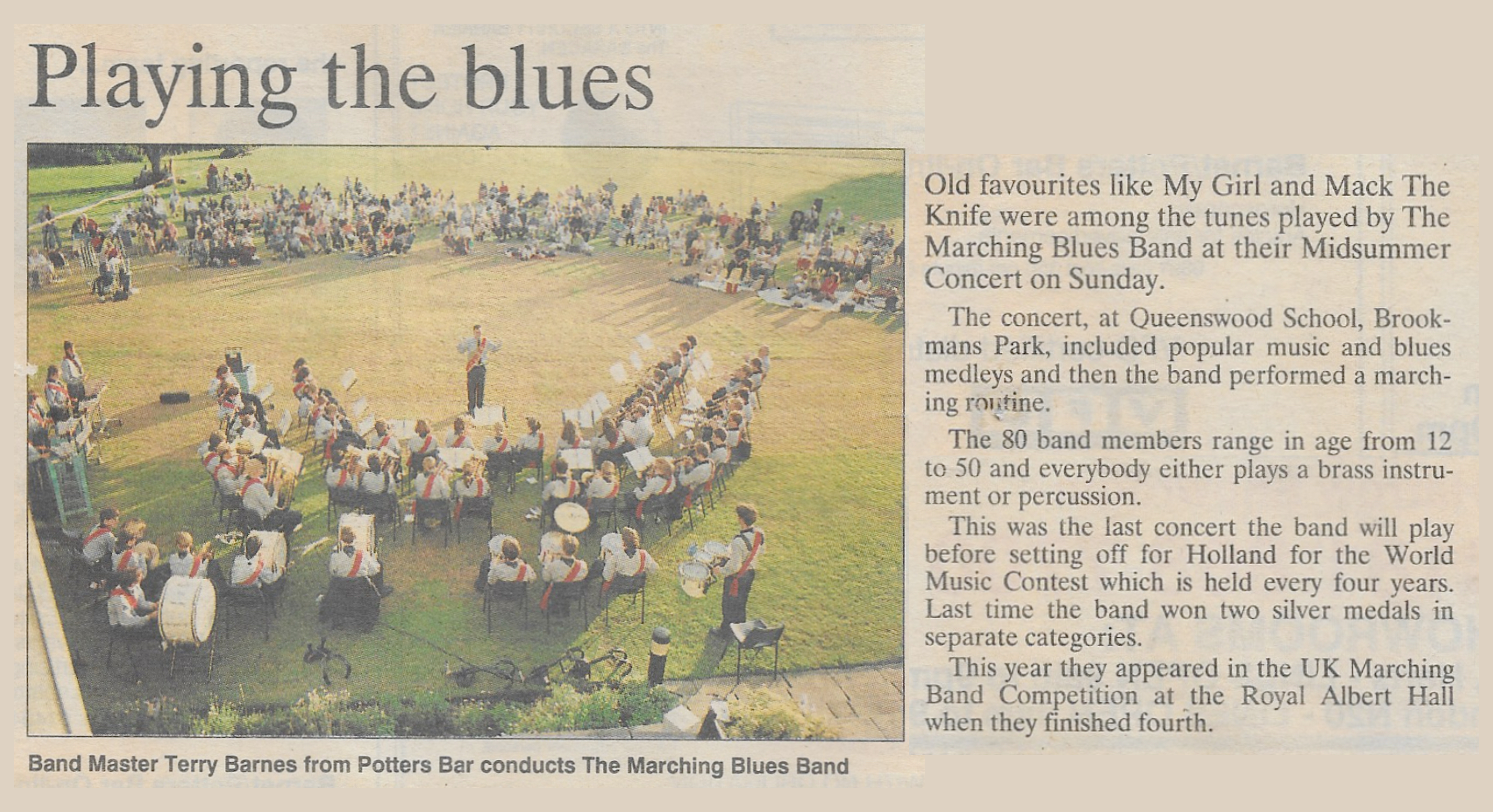 With band members not wanting to leave, the band deregistered as a Scout & Guide Band and formed their own Charity and Constitution as “The Hertfordshire Band Academy”. Not wanting to lose their legacy, the band continued performing as The Marching Blues.